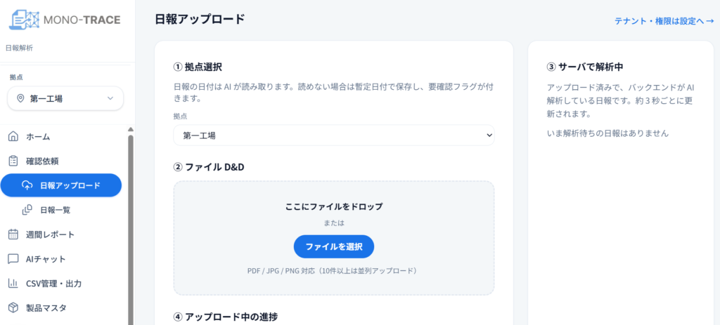 ドラッグ&ドロップやファイル選択でPDF、JPG、PNG形式でアップロードできます。