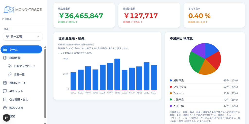 - 読みこんだ日報のデータを元に、工場の出来高や損失をダッシュボードで表示