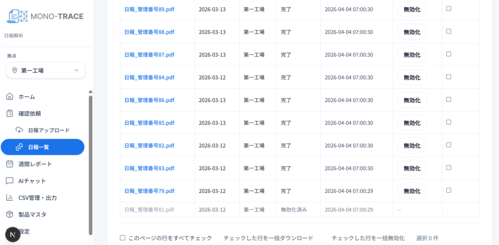 読みこんだ日報は、一覧としてここに表示されます。間違ってアップロードしてしまったときとかは、この画面から無効化すれば、解析結果も無効化出来るので誤操作による修正を可能にしています。