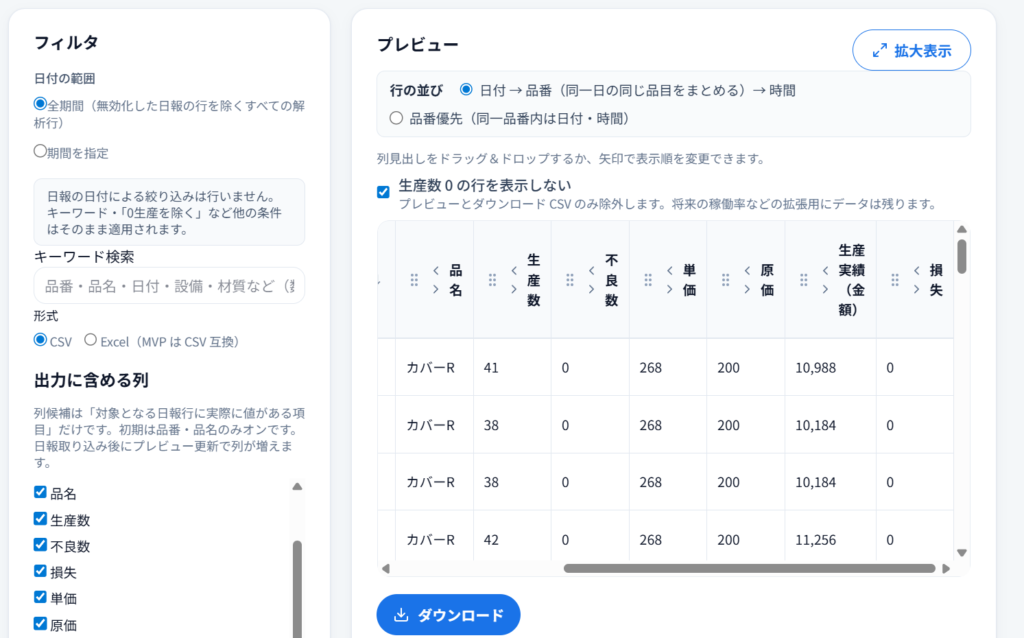 解析した日報データは、全ての生産履歴、時間を元にCSV形式で蓄積されていきます。