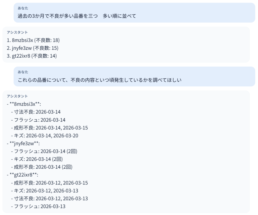 読みこんだ日報データから回答していくため、データが蓄積されるほど過去との比較が出来るようになっていく設定です。