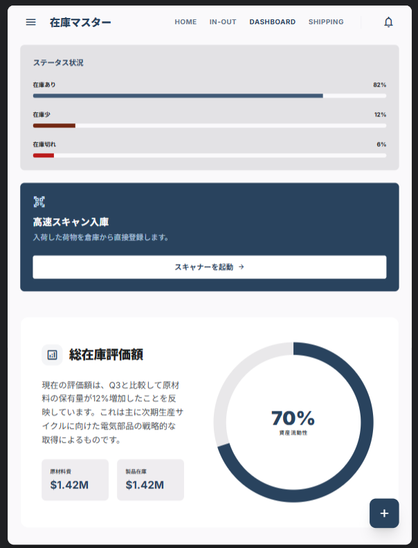 「在庫管理システムのダッシュボード画面を作って。製造業の現場向けで、在庫数が少ないアイテムを一目で確認できる画面にしてほしい」