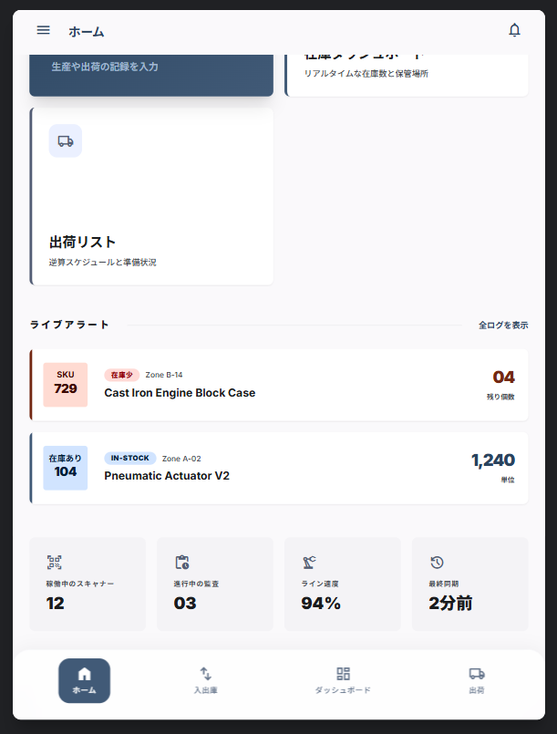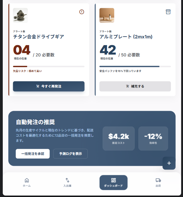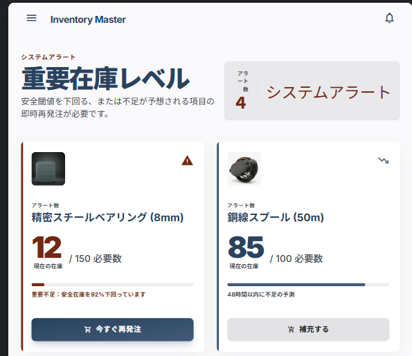 例えば「精密スチールベアリング(8mm)」のカードには、現在の在庫数「12個」と必要数「150個」が大きく表示され、「安全在庫を92%下回っています」というアラートが出ています。