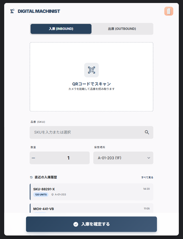 実際に商品を受け入れたり、出荷したりするときの入力画面です。入出庫管理画面は1つの画面で、上部のタブを切り替えることで入庫画面、出庫画面を切り替えられるようにしています。