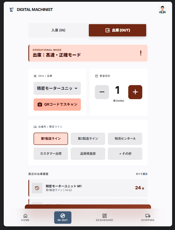 上部ナビゲーションには「Home | In-Out | Dashboard | Shipping」の4カテゴリが並んでいて、業務の流れに沿ったメニュー構成になっています。