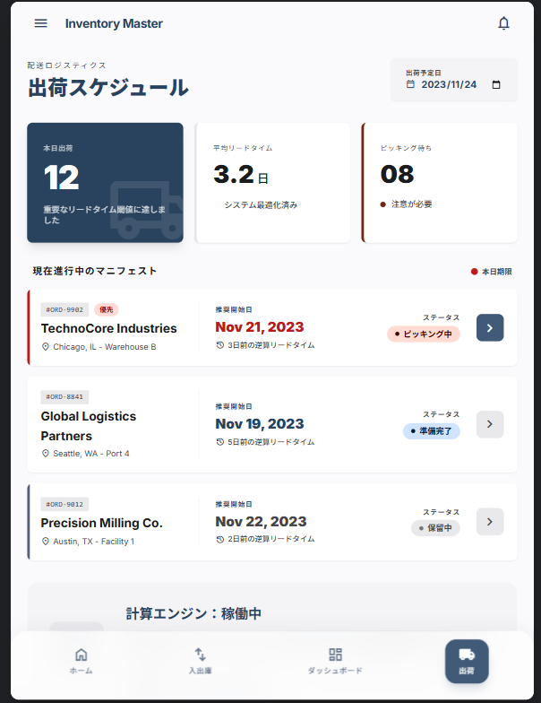 出荷予定の品目リストや、倉庫間の移動を管理する画面です。