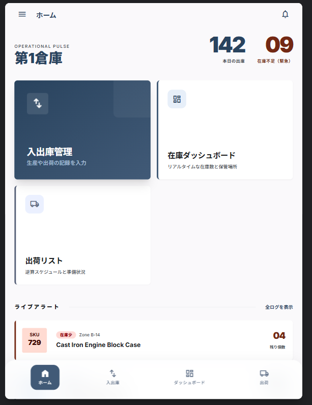 ホーム画面に本日の出荷数と、在庫アラートが出るようにしているため、在庫不足を事前に防ぎやすくしています。