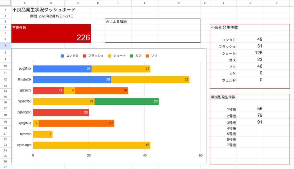 不良分析ダッシュボードのダミー。AIに何の不良が多いか、どの機械で不良が多いかを分析させたい