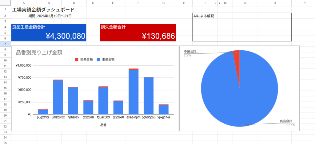 工場生産実績の金額の見える化ダッシュボードのダミー。AI解説付き