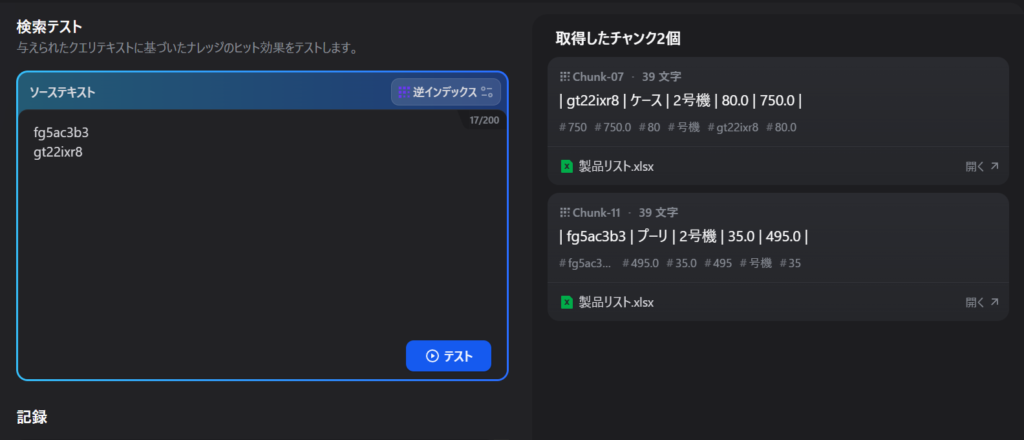 Difyのナレッジ管理画面には、登録したデータが正しく検索できるか試す「クエリテスト」機能があります。
