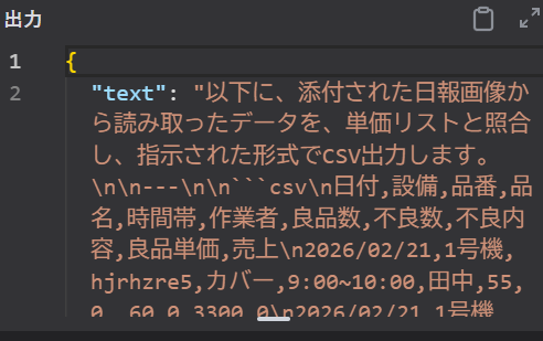 出力:2026/02/21,1号機,hjrhzre5,カバー,9:00~10:00,田中,55,0,,60.0,3300.0