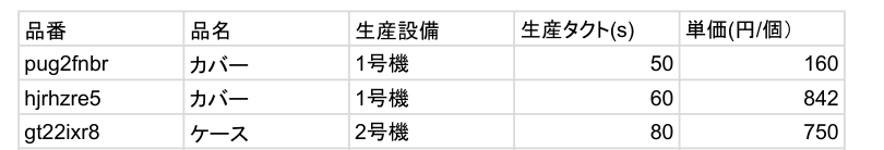 上記、製品リストの生産タクトの数字を単価と勘違いして、計算していました・・・。
