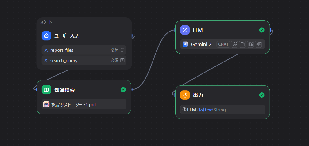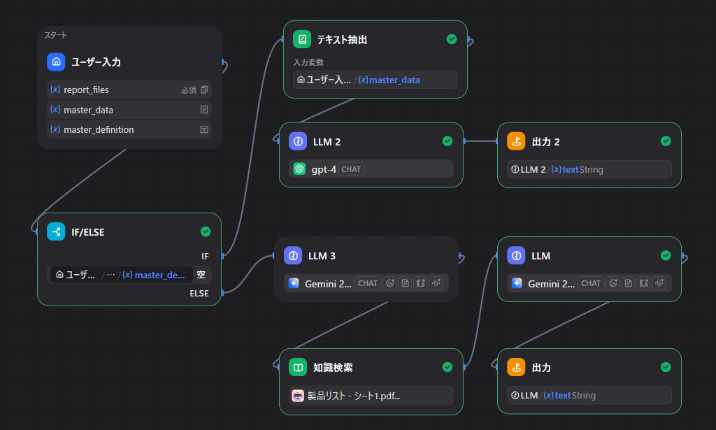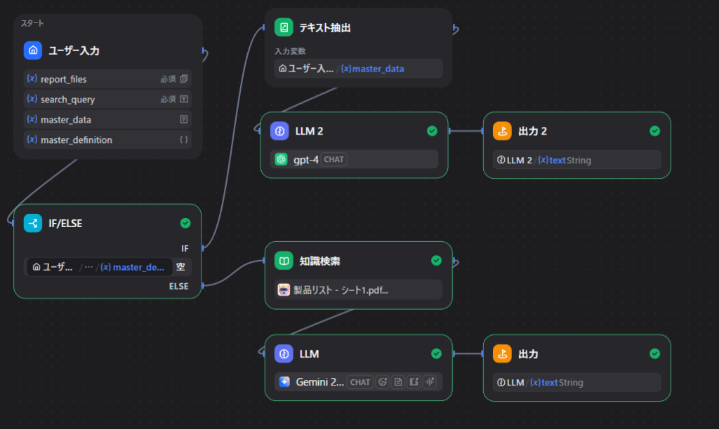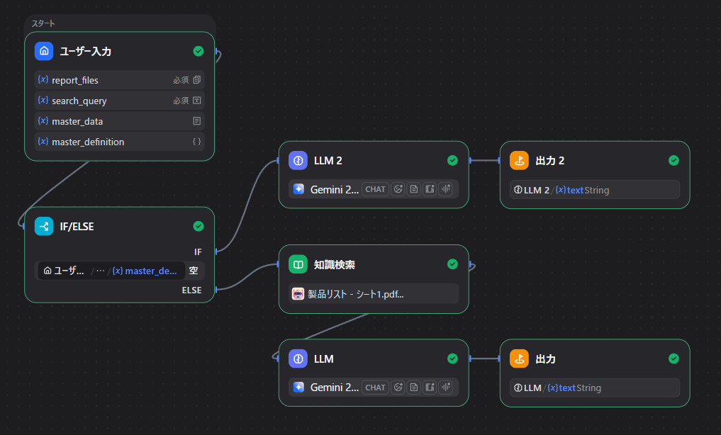 Difyで組んでいるワークフロー(業務の流れ)はこんな感じにしています。